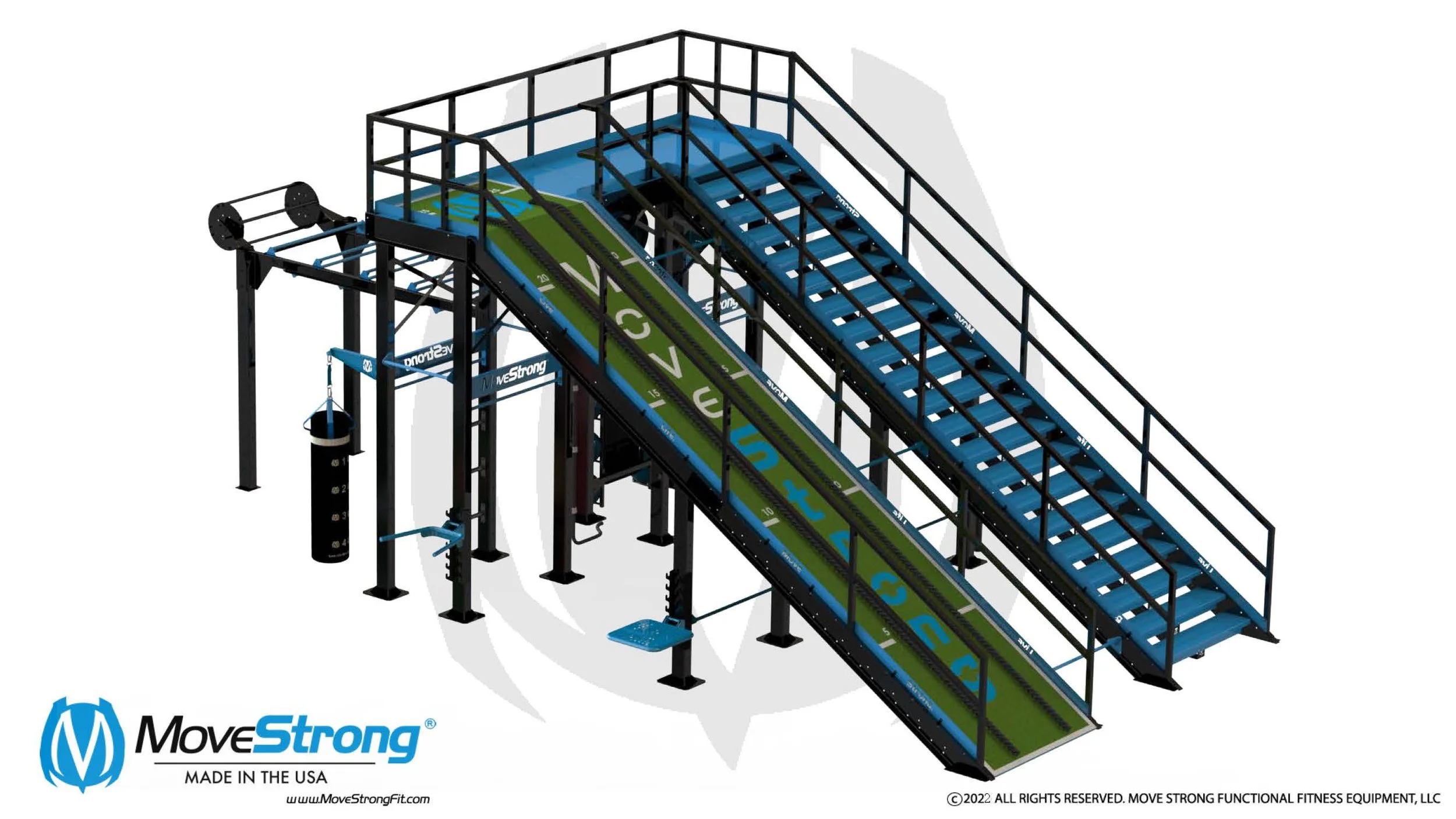 A pillar in functional fitness and locomotion training is movement with one foot in front of the other. The long awaited MoveStrong Functional Training Staircase and Ramp Obstacle is now available to focus on just that! It provides the added challenge of locomotion UPWARDS on a staircase and ramp with countless exercises options that build true functional fitness to improve the body’s strength, stamina, conditioning, and human performance!