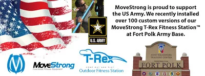 MoveStrong is proud to support the US Army. We recently installed over 100 custom versions of our MoveStrong T-Rex Fitness Station™ at Fort Polk Army Base. The MoveStrong T-Rex Fitness Station™ is specifically designed to weather tough outdoor conditions and allow for year around functional fitness and bodyweight exercising for adults.