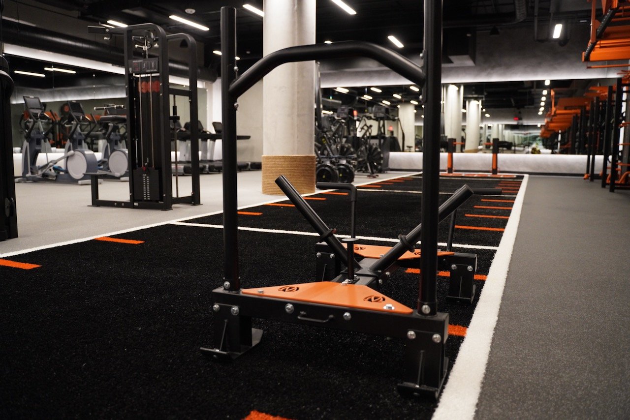 The equipment's custom paint job aligns with the gym's overall color scheme, creating a cohesive and stylish look. MoveStrong’s specialty surfacing completes the layout with additional training graphics for for sprints, sled work and floor exercises.